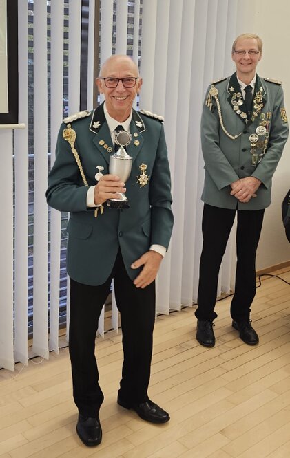 Anschließend vergab Schießsportleiter Werner Kleene die Abzeichen aus dem Insignienschießen, die Schützenschnüre und Eicheln und übergab den Prinzenpokal und den Königspokal an die erfolgreichen Schützen.